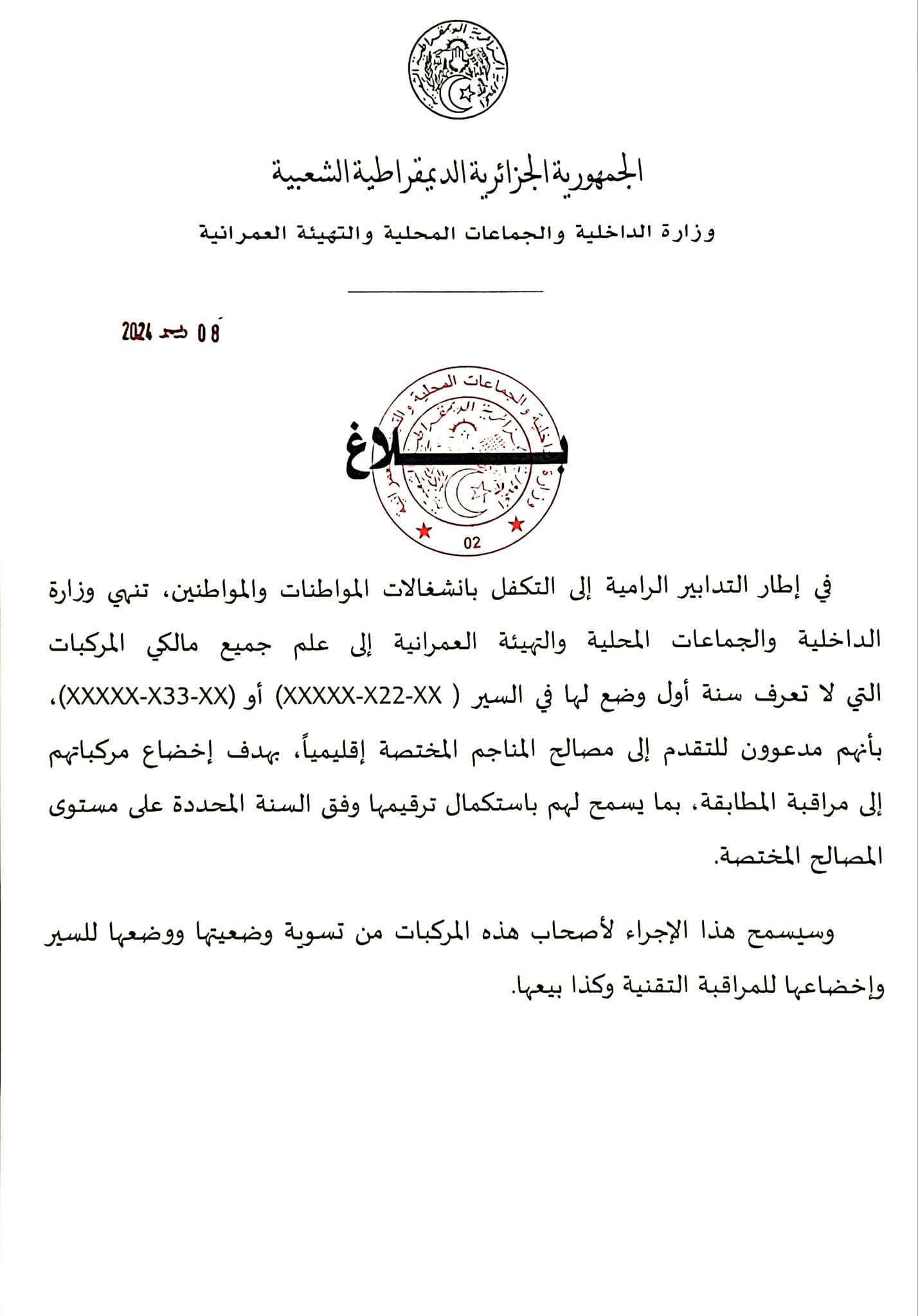 أعلنت وزارة الداخلية والجماعات المحلية والتهيئة العمرانية اليوم الأحد، عن دعوة موجهة لجميع مالكي المركبات التي لا تعرف سنة أول وضع لها في السير (xxxxx-x22-xx) أو (xxxxx-x33-xx)، للتوجه إلى مصالح المناجم المختصة إقليمياً.