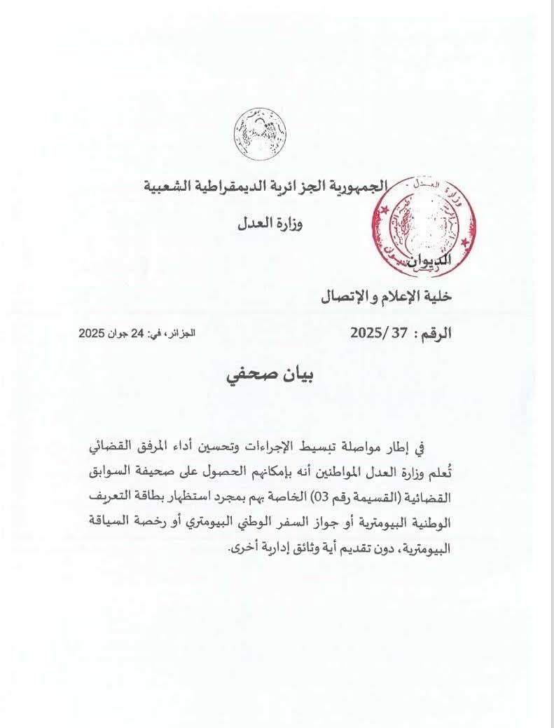 وحسب بيان للوزارة الوصية فإن هذا الإجراء يأتي في إطار مواصلة جهود الوزارة لتبسيط الإجراءات الإدارية وتحسين أداء المرفق القضائي، حيث لم يعد المواطن مطالبًا بتقديم أية وثائق إدارية إضافية للحصول على القسيمة رقم 03.
