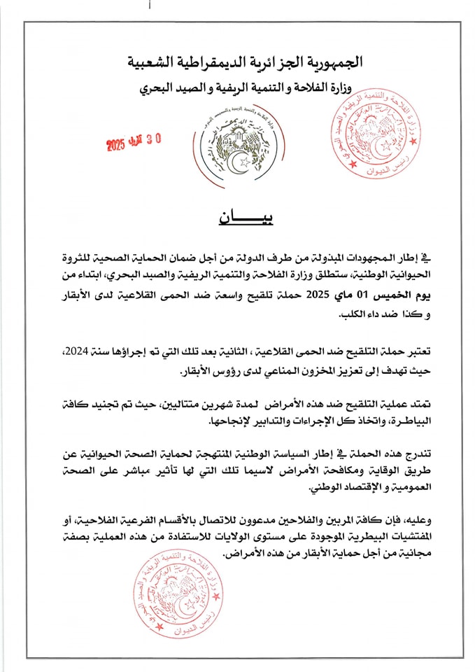 أعلنت وزارة الفلاحة والتنمية الريفية والصيد البحري عن انطلاق حملة وطنية واسعة النطاق لتلقيح الأبقار ضد الحمى القلاعية وداء الكلب، وذلك ابتداءً من اليوم الخميس، في إطار جهود الدولة الرامية إلى تعزيز الصحة الحيوانية وحماية الثروة الحيوانية الوطنية.