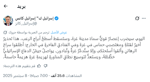 وفي المقابل هدد وزير دفاع الكيان الصهيوني، يسرائيل كاتس، اليوم الاثنين، مدينة غزة وحماس، بـ”إعصار هائل” يدمرهما ما لم تستسلم الحركة.