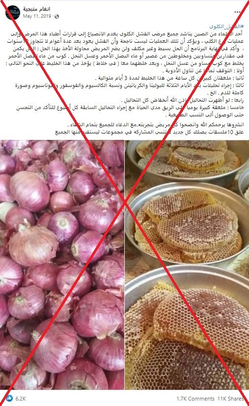 توصي المنشورات المتداولة مرضى الكلى بوقف العلاجات التي وصفها لهم أطبّاؤهم والشروع في خلطة البصل والعسل ذات النتائج الخارقة المزعومة.