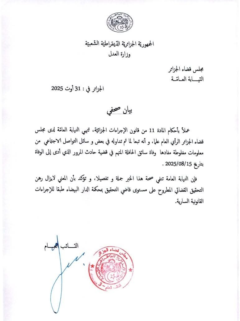 فندت النيابة العامة لدى مجلس قضاء الجزائر، أمس الأحد، صحة الأخبار المتداولة عبر بعض وسائل التواصل الاجتماعي بشأن وفاة سائق الحافلة المتهم في حادث المرور الذي وقع بتاريخ 15 أوت المنصرم.