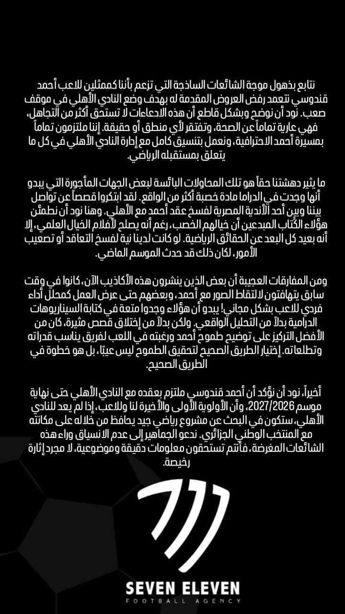 وجاء في بيان الوكالة: “نتابع بذهول الشائعات التي تؤكد بأننا نرفض العروض المقدمة لأحمد قندوسي بهدف وضع النادي الأهلي في موقف صعب”.