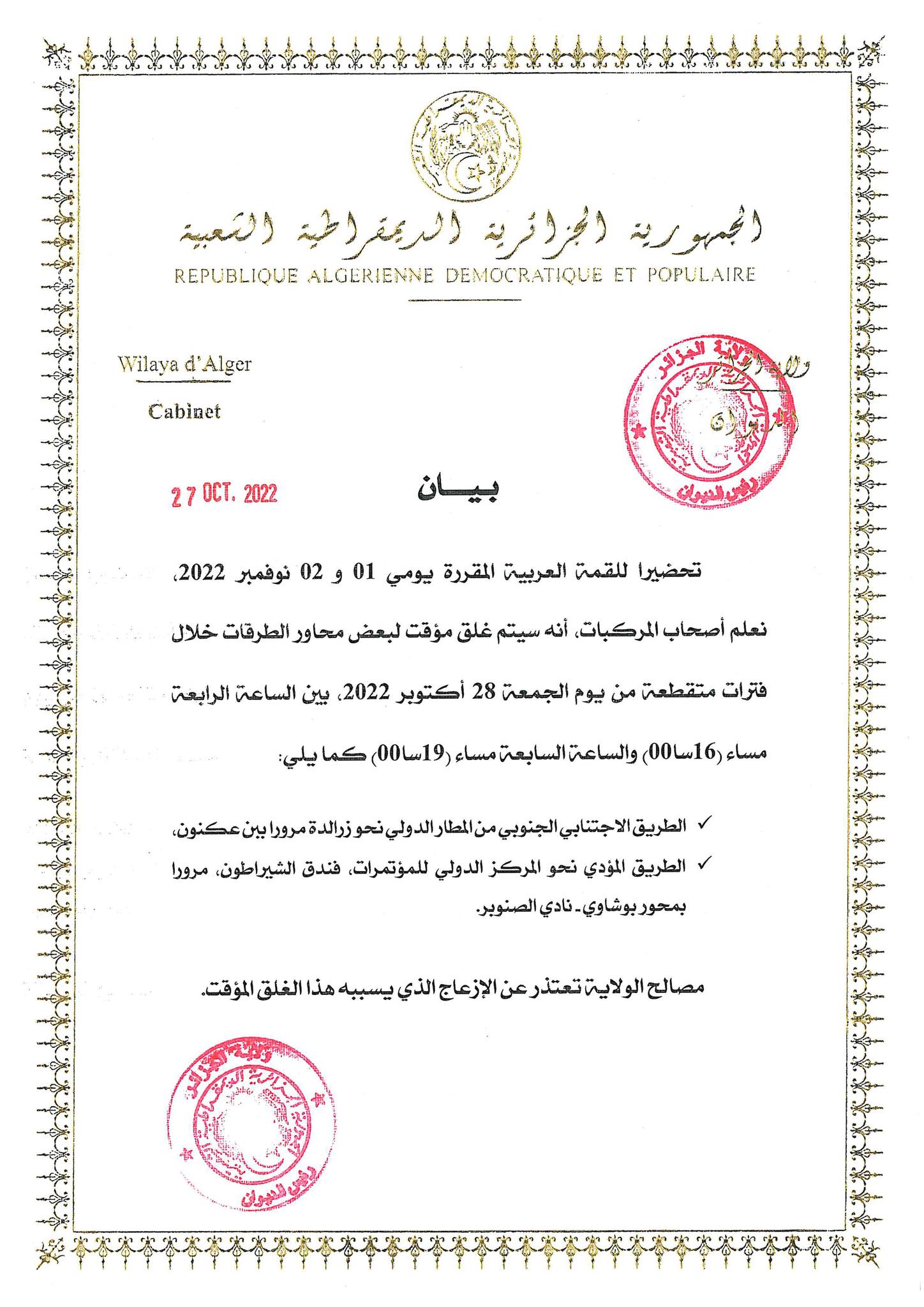 أعلنت ولاية الجزائر، الخميس، عن غلق مؤقت لبعض محاور الطرقات خلال فترات متقطعة يوم غد الجمعة، بين الساعة الـ16:00 مساء والـساعة 19:00، تحضيرا للقمة العربية المقررة يومي 1 و2 نوفمبر.
