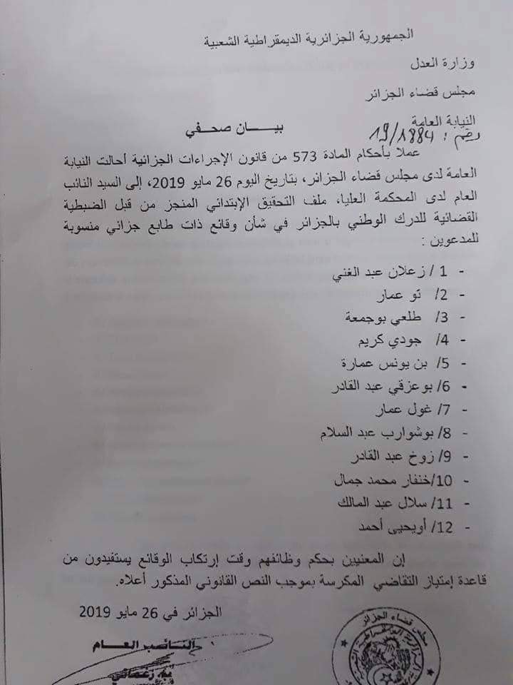 Douze dossiers de hauts responsables de l’Etat ont été transférés, ce dimanche 26 mai 2019, à la Cour suprême. C’est ce qu’a indiqué un communiqué du tribunal d’Alger signé par le procureur général, Belkacem Zeghmati.