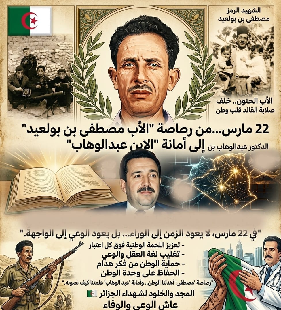 ثمة تواريخ في أجندة الأمم لا تُطوى بمرور السنين، بل تزداد ثقلًا كلما اشتدت التحديات. و22 مارس ليس مجرد ذكرى، بل وقفة تأمل أمام مسارين اختصرا حكاية الجزائر: مسار الشهيد الرمز مصطفى بن بولعيد، ومسار نجله الدكتور عبد الوهاب بن بولعيد. إنها حكاية انتقال الفكرة من جيل الثورة إلى جيل الدولة، ومن ضريبة الدم إلى أمانة الوعي.