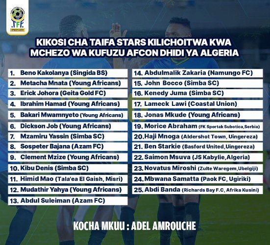 ووجّه الناخب الوطني التنزاني الدّعوة إلى 25 لاعبا، يوجد بينهم المهاجم سيمون مسوفا الذي انتقل مُؤخّرا إلى نادي شبيبة القبائل. والقائد موابانا ساماتا من فريق جينك البلجيكي، الذي سبق له خوض مقابلات دولية ضد “مُحاربي الصّحراء”.