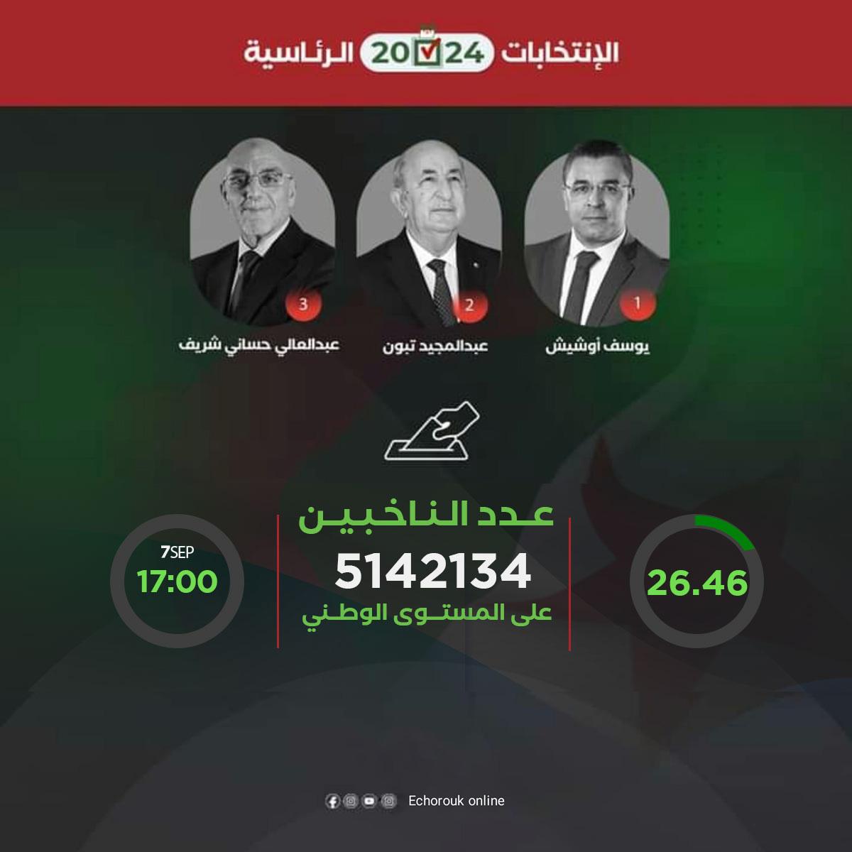 بلغت نسبة المشاركة الأولية في الإنتخابات الرئاسية على الساعة الخامسة زوالا (17:00)، حسب ما أفادت به السلطة الوطنية المستقلة للإنتخابات 26,46%، كما تقرّر تمديد فتح المكاتب إلى غاية الساعة الثامنة ليلا (20:00) للسماح للمواطنين بالتصويت.