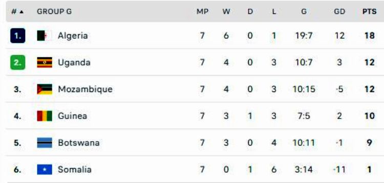 وبِإلقاء النظرة على جدول ترتيب الفوج السابع، نجد أن بطاقة التأهّل سواء بِمركز الصدارة أو الوصافة، تهمّ المنتخب الوطني الجزائري في المقام الأول، وفريقَي أوغندا رفقة الموزمبيق بِدرجة ثانوية.