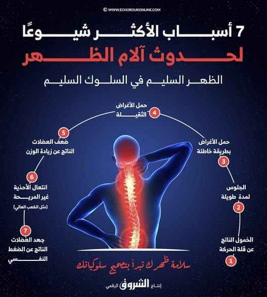 طوال اليوم والإجهاد أو الإصابات المفاجئة..ومن بين النصائح العملية للتعامل مع هذه المسببات كيفية الجلوس ومعالجة التوتر النفسي والتخلص من الشد