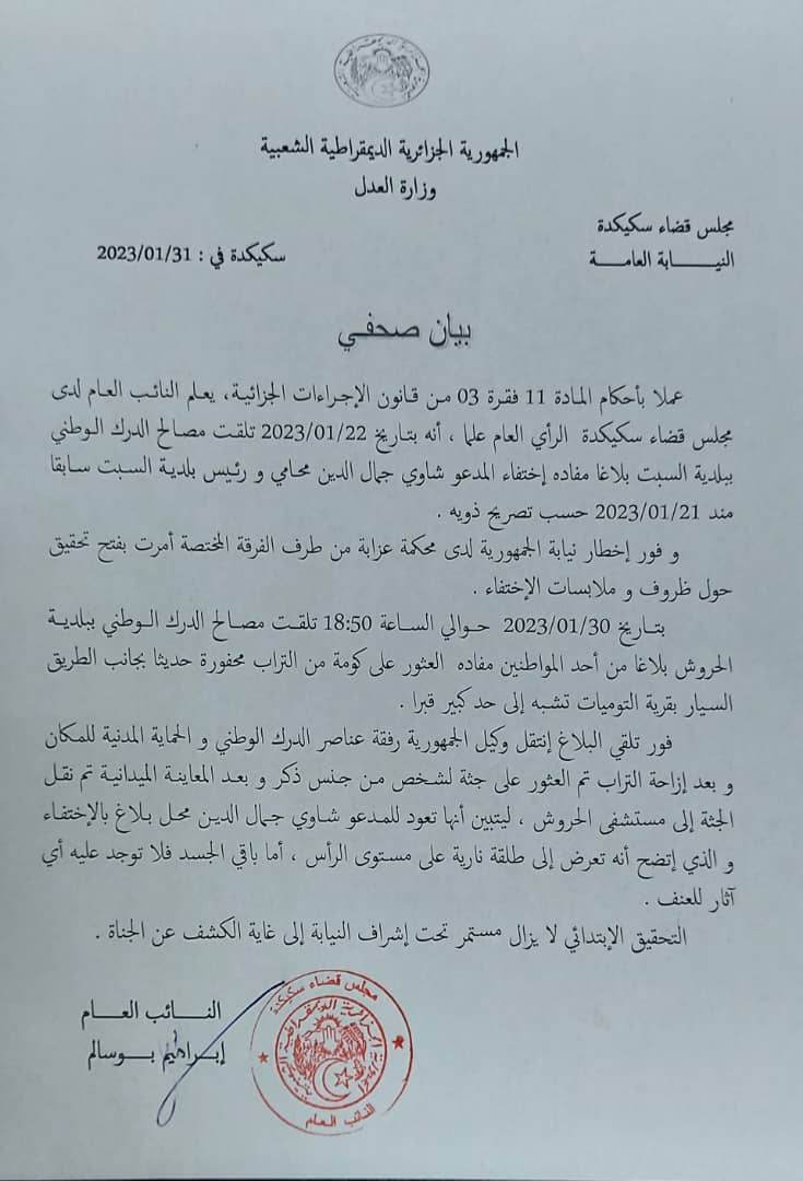 Le 31 janvier 2023, le parquet près le palais de justice de Skikda a rendu public un communiqué dans lequel il est revenu sur l’assassinat de l’avocat et ex-P/APC de Es Sebt (Skikda) Djamel Eddine Chaoui.