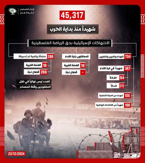 واختتم اتحاد الكرة الفلسطيني البيان، قائلا إن الرّقم ليس مضبوطا بِدقّة، بِسبب كثرة المفقودين، وندرة المصادر.