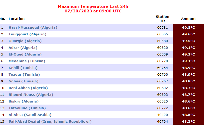وحلت في المرتبة الثانية عالميا مدينة تقرت بدرجة حرارة 49.6 تلتها ورقلة فأدرار ثم الوادي في المرتبة الخامسة.