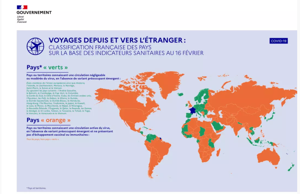 Les voyageurs doivent produire un motif impérieux pour se rendre dans un pays classé orange ou rouge, sauf s’ils peuvent justifier d’un parcours vaccinal complet avec un vaccin reconnu par l’Agence européenne du médicament. Pour voyager en Europe, il n’est pas nécessaire de justifier du motif de son déplacement, mais des obligations de test préalable et de quarantaine peuvent s’appliquer. La carte des pays verts, orange et rouges a été actualisée le 16 février 2022.