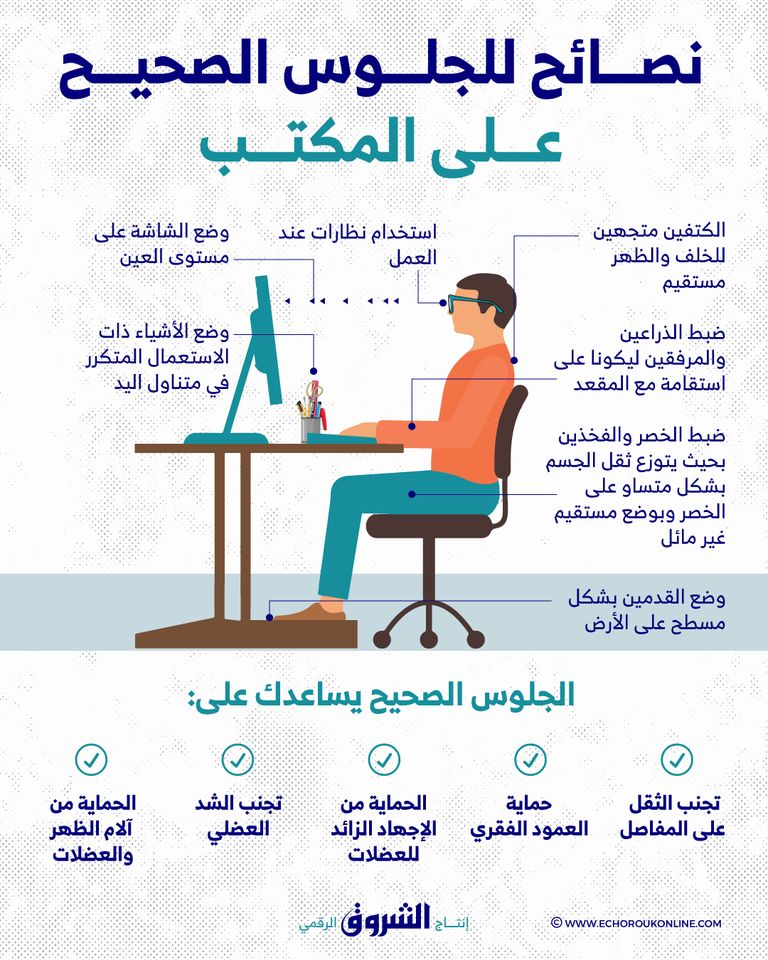 يقضي الموظف جزءًا غير يسير من يومه جالسًا في مكتبه، لذا ينبغي الحرص على الجلوس بطريقةٍ صحية وسليمة. ذلك أن الجلوس الصحي من الأمور التي يغفل عنها كثير من الناس، مما قد يسبب إجهادًا للجسم