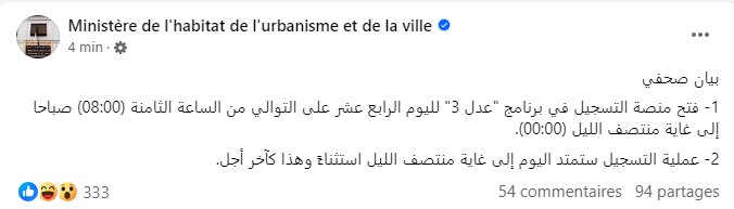 Selon le communiqué du ministère, “la plateforme d’inscription au programme AADL 3 sera ouverte pour le quatorzième jour consécutif de 08h00 à minuit”.