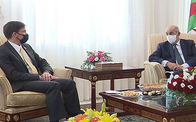 « Le président de la République Abdelmadjid Tebboune a reçu jeudi le secrétaire américain à la Défense, Mark Thomas Esper, qui effectue une visite de travail en Algérie », a indiqué un communiqué de la présidence de la République.