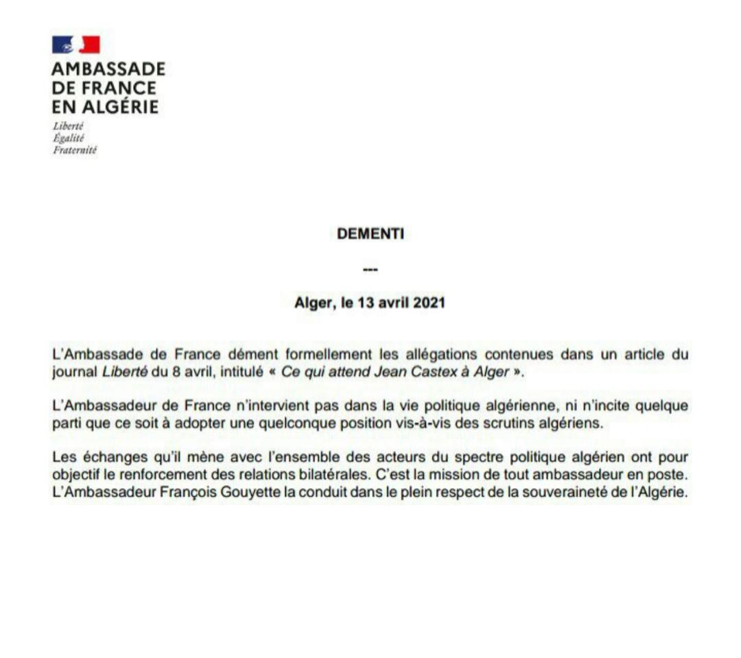 «L’Ambassadeur de France n’intervient pas dans la vie politique algérienne, ni n’incite quelque parti que ce soit a adopter quelque position vis-a-vis des scrutins algériens», peut-on lire dans le communiqué de l’Ambassade de France.