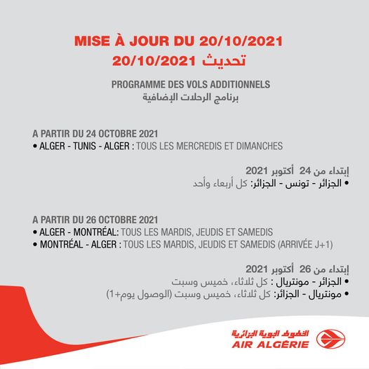 Air Algérie a publié un communiqué sur sa page Facebook son programme de vols additionnels de et vers Tunis et Montréal a partir respectivement du 24 et du 26 octobre.