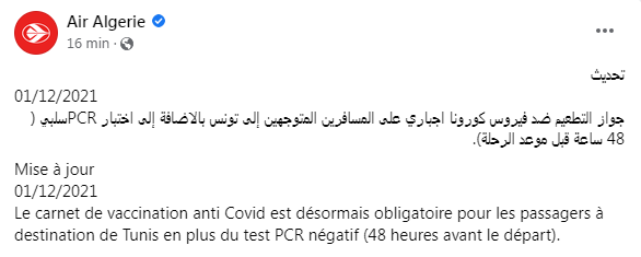 Le carnet de vaccination anti Covid est désormais obligatoire pour les passagers a destination de Tunis en plus du test PCR négatif, soit 48 heures avant le départ.