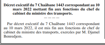 “Par décret exécutif du 10 mars 2022, il est mis fin aux fonctions de chef de cabinet du ministre des transports, exercées par Djamel Benredjem”, peut-on lire dans le 17e numéro du Journal Officiel (JO) paru le 10 mars dernier.