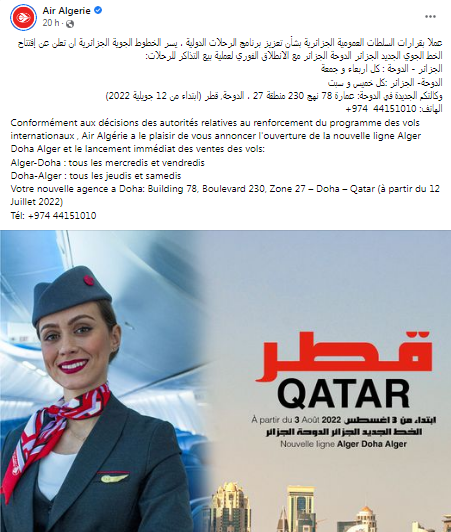 «Conformément aux décisions des autorités relatives au renforcement du programme des vols internationaux, Air Algérie a le plaisir de vous annoncer l’ouverture de la nouvelle ligne Alger Doha Alger et le lancement immédiat des ventes des vols», a indiqué la compagnie dans un communiqué.