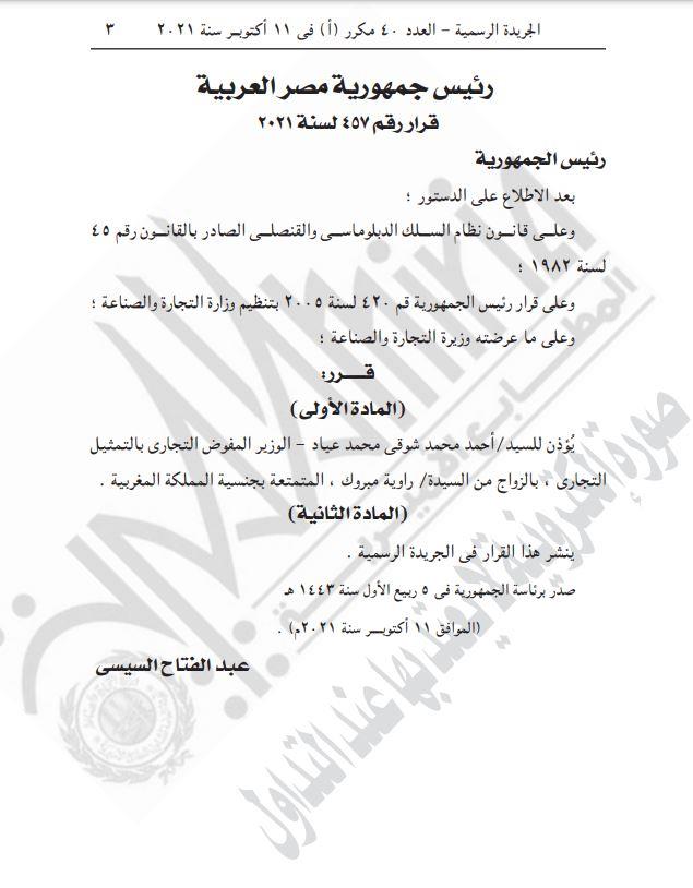 Il est mentionné dans la décision que Ahmed Mohamed Shawki Mohamed Ayyad, du ministre délégué au Commerce est autorisé a épouser la ressortissante marocaine Rawya Mabrouk.