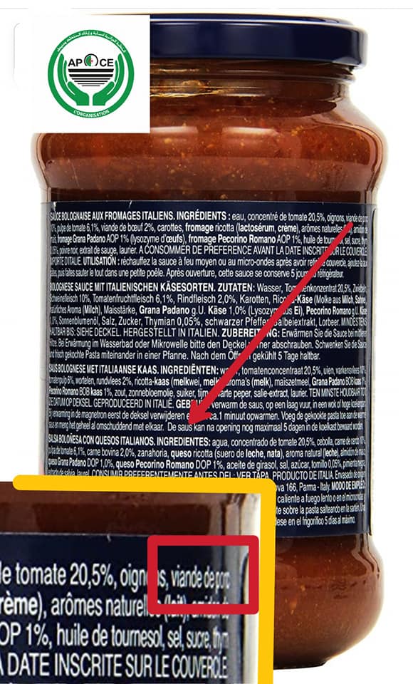 APOCE a expliqué dans un post sur Facebook qu’il s’agit d’une sauce de marque “Barilla” qui est composée de morceaux de la viande porcine.