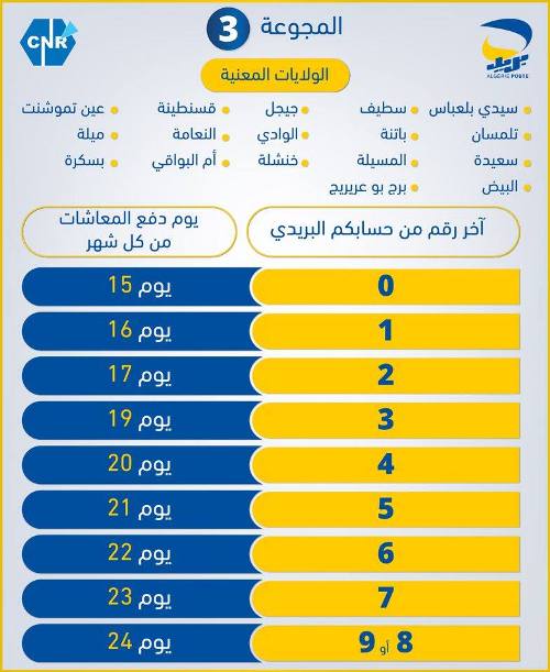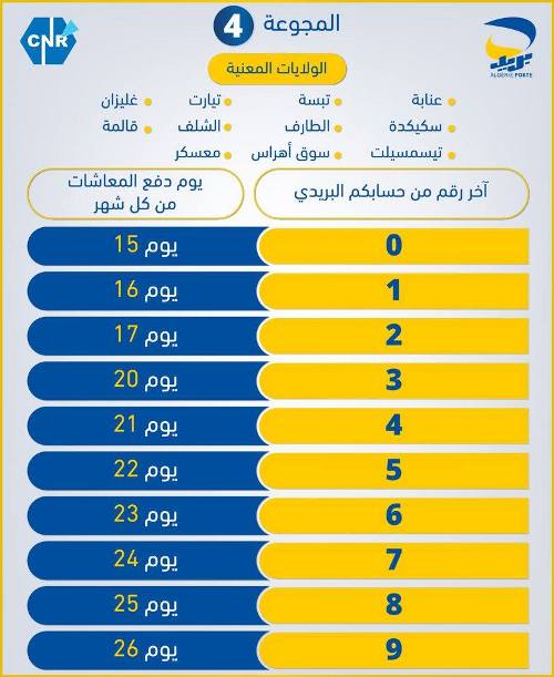 L’entreprise Algérie Poste a fait savoir que ce nouveau calendrier mis en place vise à assurer à un meilleur niveau de service au profit de l’ensemble des citoyens, notamment les retraités et ayants droit et ce en niveau de tous les bureaux postes.