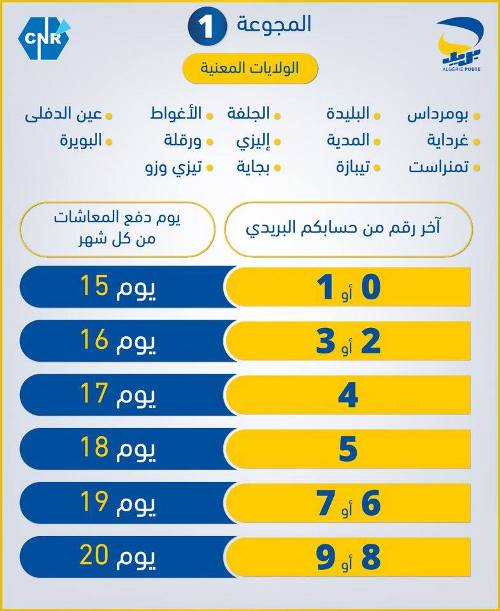 Le premier groupe concerne les wilayas de : Médéa, Blida, Tipasa, Aïn Defla, Béjaïa, Bouira, Tizi Ouzou, Boumerdès, Illizi, Laghouat, Ouargla, Djelfa, Ghardaïa et Tamanrasset.