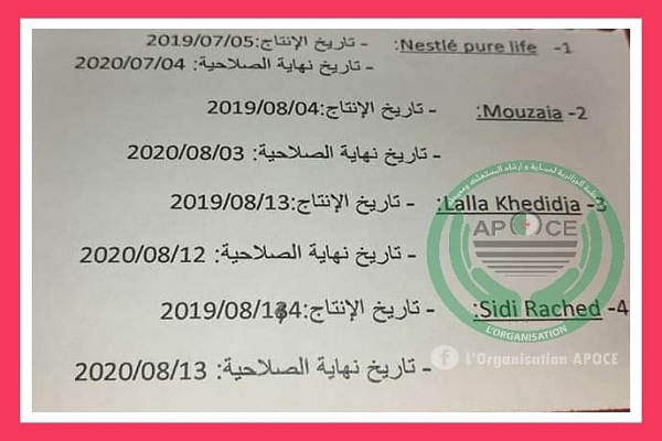 Selon l’APOCE, l’interdiction de commercialisation concernerait des quotas d’eau minérale produits par ses marques en juillet et Août, par les marques Nestlé pure life (Blida), Mouzaïa (Blida), Lala Khedidja (Tizi-Ouzou) et Sidi Rached (Tizi-Ouzou), dont la date de péremption est prévue dans une année à compter du mois de la production.