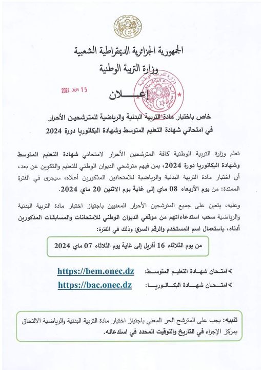 Tous les candidats libres concernés par l’épreuve d’éducation physique et sportive doivent retirer leurs convocations via les sites électroniques de l’Office national des examens et des concours (ONEC), (https://bem.onec.dz) et (https://bac.onec.dz) en introduisant le nom d’utilisateur et le numéro confidentiel, et ce à compter “de mardi 16 avril jusqu’au mardi 07 mai 2024”, précise la même source.