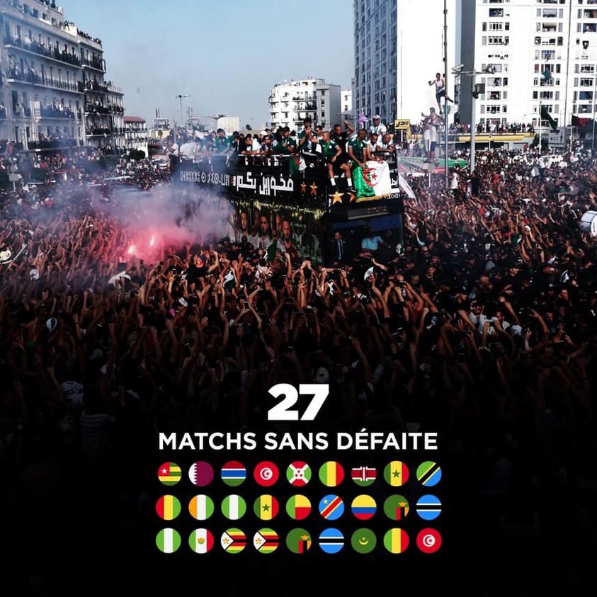 Le milieu de terrain des Verts a tenu a féliciter ses coéquipiers et le staff de la sélection pour le record d’invincibilité, soit une série de 27 matchs sans défaite sous la houlette du coach Djamel Belmadi. “Félicitations a tous pour ce record d’invincibilité”, a ajouté Bennacer tout en associant le drapeau national a son commentaire.