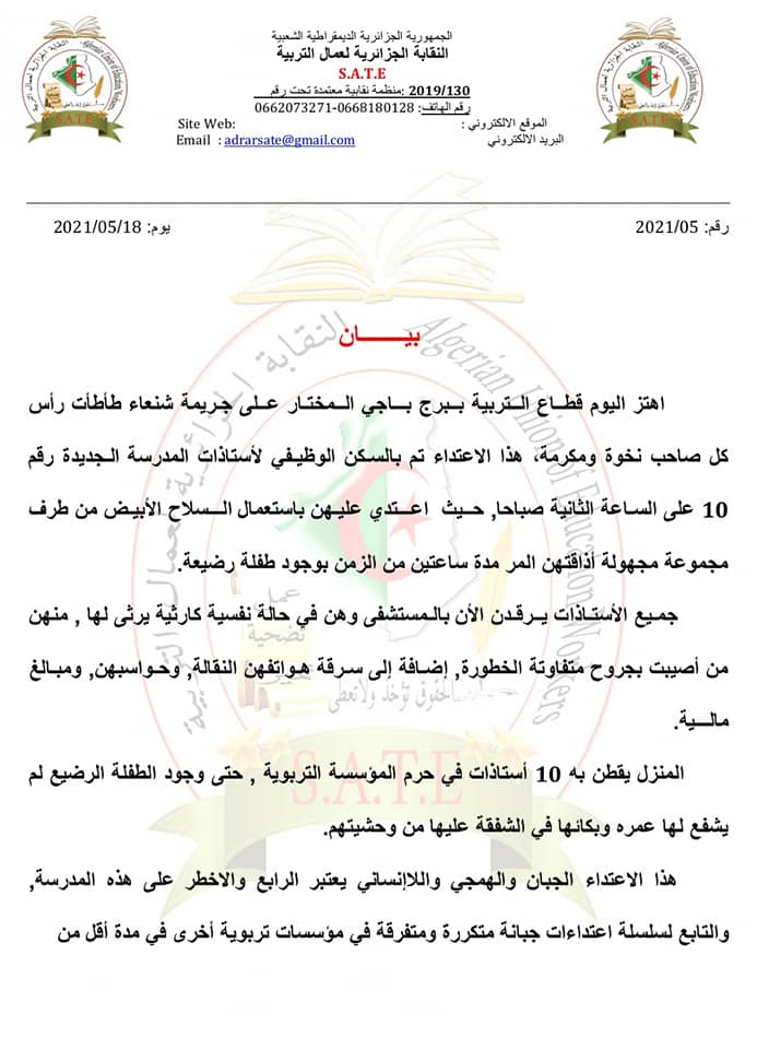 Des enseignantes ont été sauvagement violentées dans la nuit du lundi a mardi 18 mai 2021, a Bordj Badji Mokhtar, affirme le Syndicat algérien des travailleurs de l’Education (SATE), dans un communiqué largement relayé, en début de soirée, sur les réseaux sociaux.
