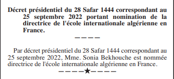 Par décret présidentiel du 25 septembre 2022, Mme. Sonia Bekhouche est nommée directrice de l’Ecole Internationale Algérienne en France (EIAF), peut-on lire dans le dernier numéro du JO.