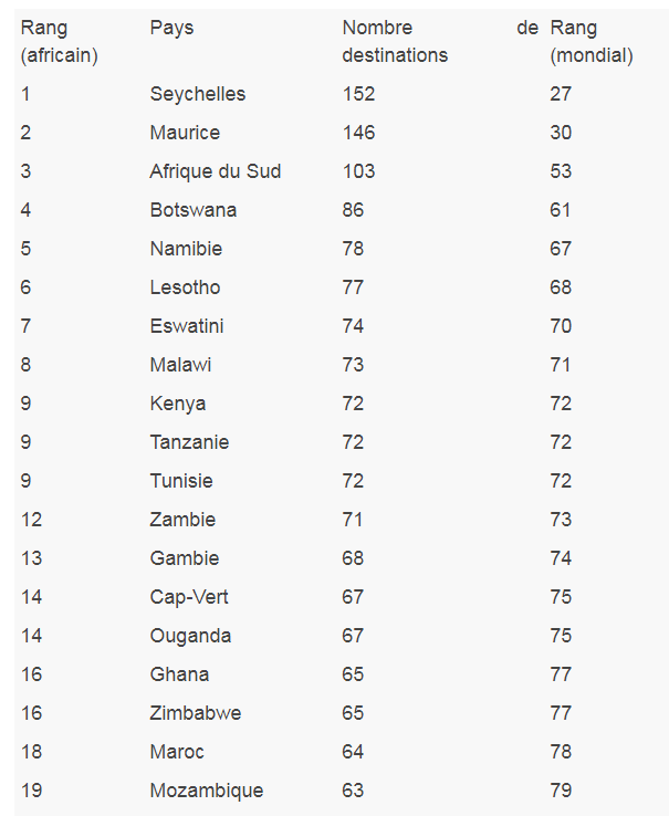 Alors qu’aucun pays africain ne figure dans le top 10, on note une progression de plusieurs Etats par rapport aux précédents classements. Cependant, seuls trois pays africains offrent un passeport qui permet de visiter plus de 100 destinations a travers le monde.