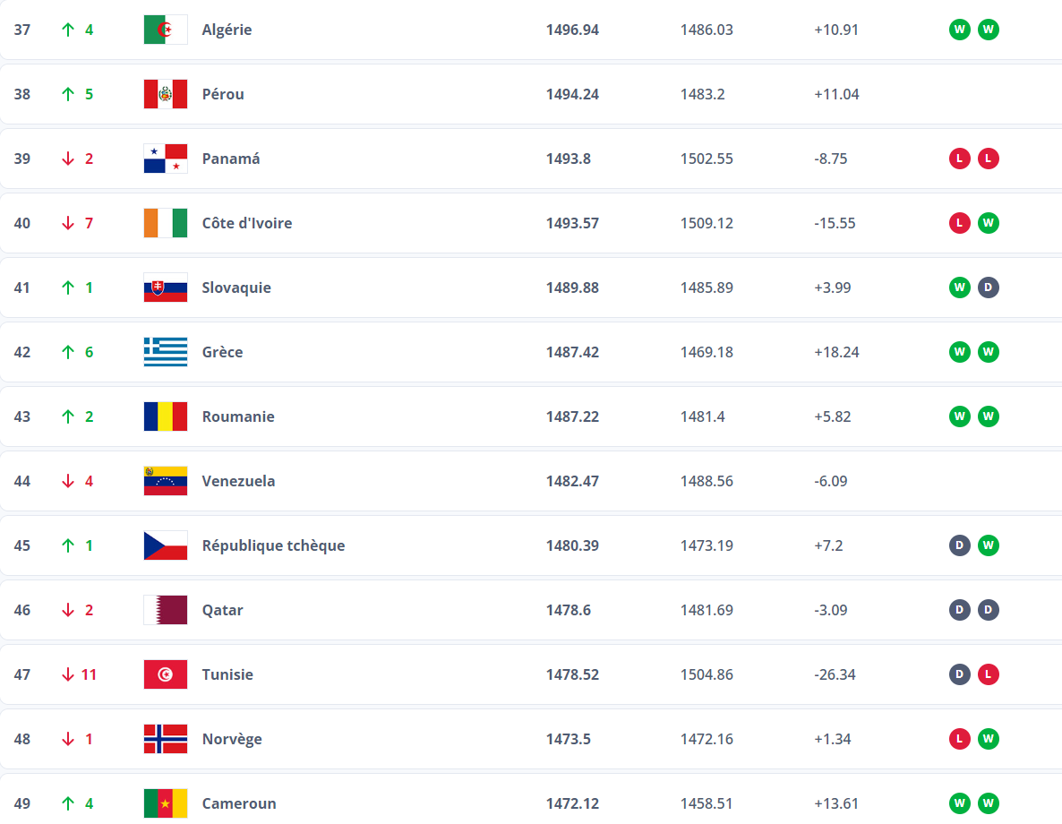 Pour ce qui est du classement des sélection africaines, les coéquipiers de Houssam Aouar occupent le 5è rang derrière le Maroc (13è), le Sénégal (20è) , l’Egypte (30è) et le Nigeria (36è).