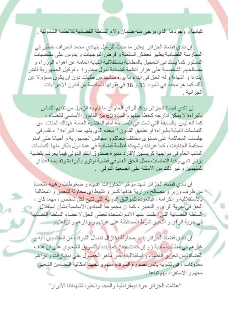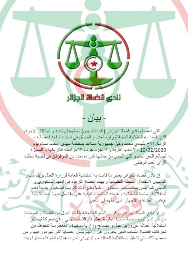 «Les membres du Club des magistrats – en cours de création – fustigent et condamnent la convocation par l’inspection générale du ministère de la Justice d’un de membres du Club à savoir Belhadi Mohamed, procureur de la République adjoint près le tribunal de Sidi M’hamed rien pour avoir plaidé l’innocence des détenus du Hirak», peut-on lire dans le communiqué du Club.