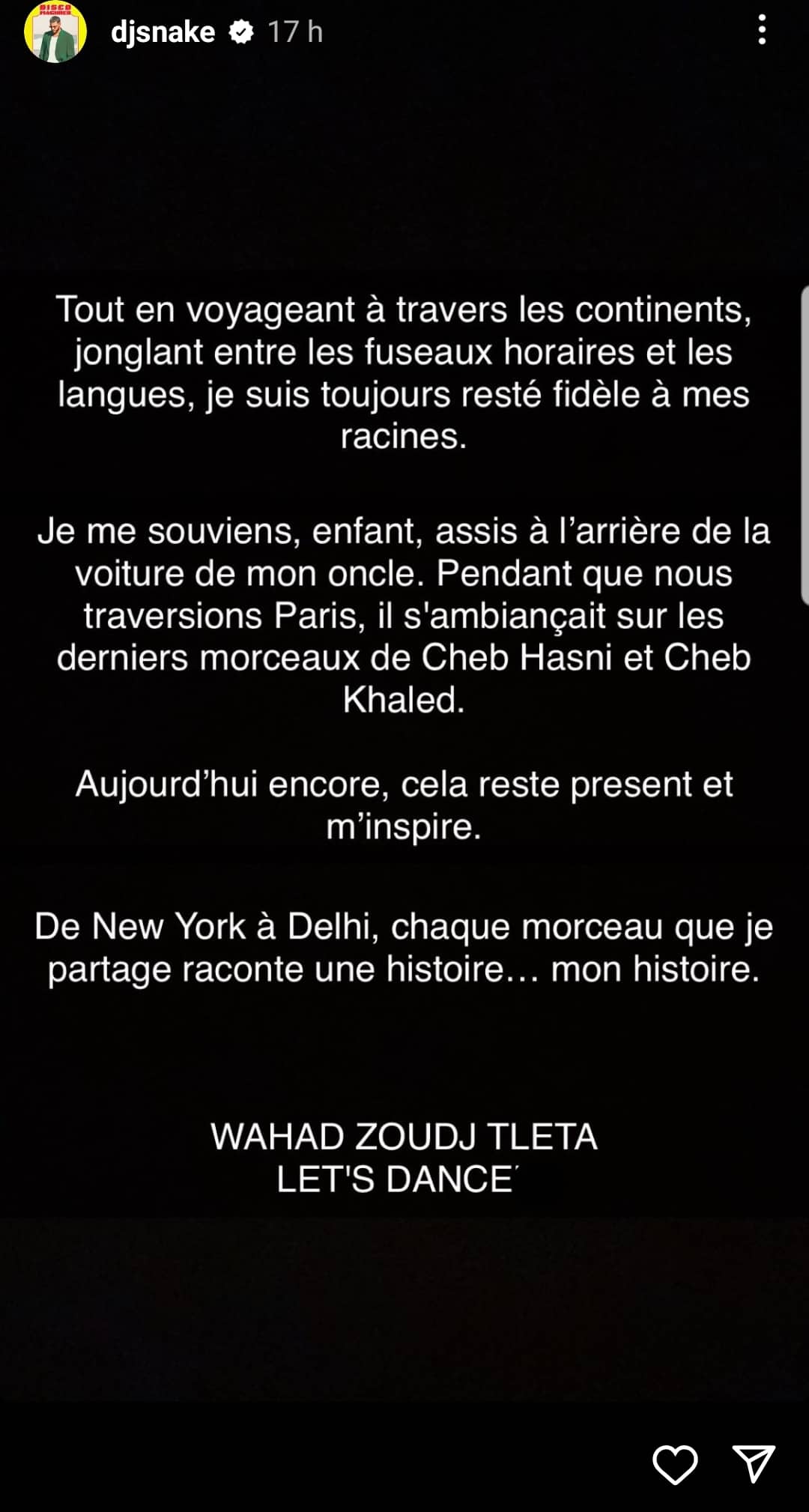 “مهما زرت من بلد، ومهما عبرت من قارات ولغات العالم. سأبقى دائما وفيّا لجذوري”. بهذه الكلمات عبّر DJ snake عن امتنانه لجمهوره في الجزائر بعد نجاح عمله الأخير Disco maghreb.