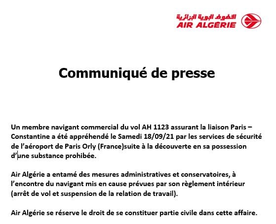 « Un membre naviguant commercial du vol AH 1123 assurant la liaison Paris-Constantine a été appréhendé le samedi 18/09/2021 par les services de sécurité de l’aéroport de Paris Orly suite a la découverte en sa possession d’une substance prohibée », affirme un communiqué de la compagnie nationale.