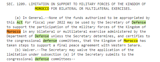 Selon le Congrès, le ministre de la Défense US ne serait autorisé a utiliser les fonds destinés dans la loi de finances 2022 au soutien de la participation des forces militaires marocaines a un exercice conjoint ou multilatéral -organisé par le Pentagone- que si le ministre affirmait aux commissions de défense au Congrès que le royaume du Maroc ait pris des démarches en soutien a l’accord de paix définitif avec le Sahara occidental.