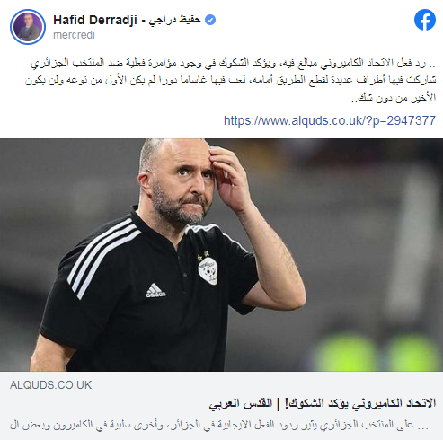 Depuis que le Cameroun a réussi a battre l’Algérie en barrage de Coupe du monde dans des conditions litigieuses, la bataille fait rage des deux côtés avec l’espoir du côté des Fennecs de pouvoir montrer a la FIFA des éléments pouvant entraîner la remise en cause du résultat. Ces dernières heures, le journaliste de BeIN Sports Hafid Derradji vient de lacher un sacré scoop.