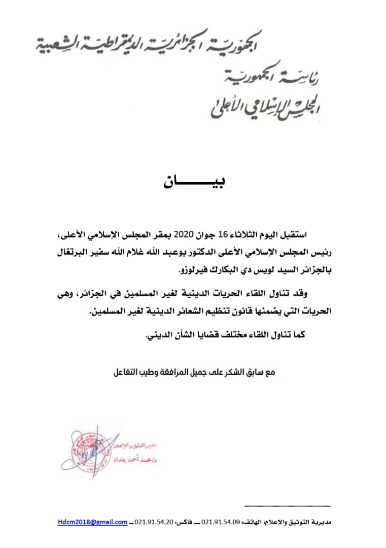 Selon la même source, l’entretien a porté sur « les libertés religieuses des non musulmans en Algérie, des libertés énoncées dans la loi fixant les conditions et règles d’exercice des cultes autres que musulman ».