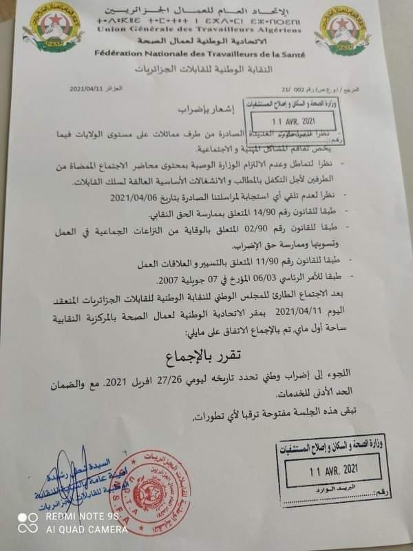 La Fédération nationale des travailleurs de la santé (FNTS) affiliée a l’Union générale des travailleurs algériens (UGTA) a annoncé une grève nationale de deux jours les 26 et 27 avril en cours.