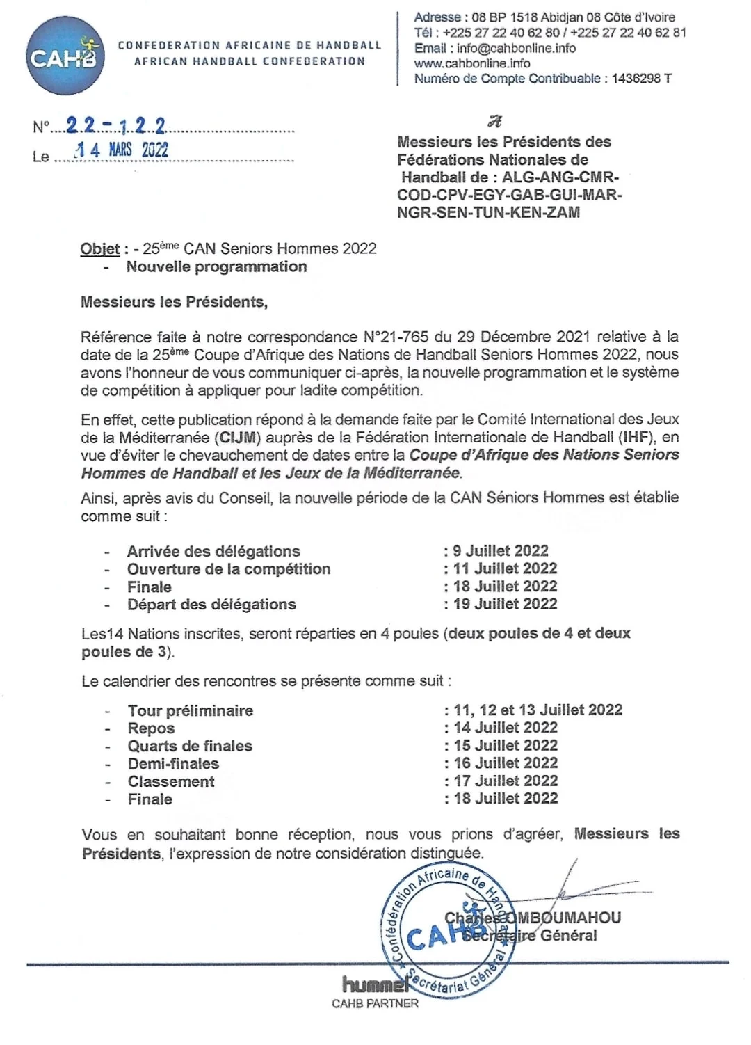 La CAHB a informé adressé les fédérations nationales dans une correspondance que le rendez-vous africain initialement prévu au Maroc le 22 juin 2022 est reporté a la période allant du 11 au 18 juillet 2022 sur décision de la Fédération internationale de handball en réponse a la demande du Comité International des Jeux Méditerranéens (CIJM).