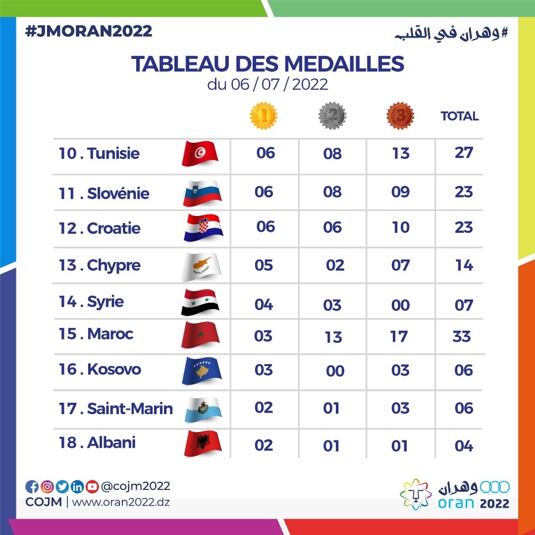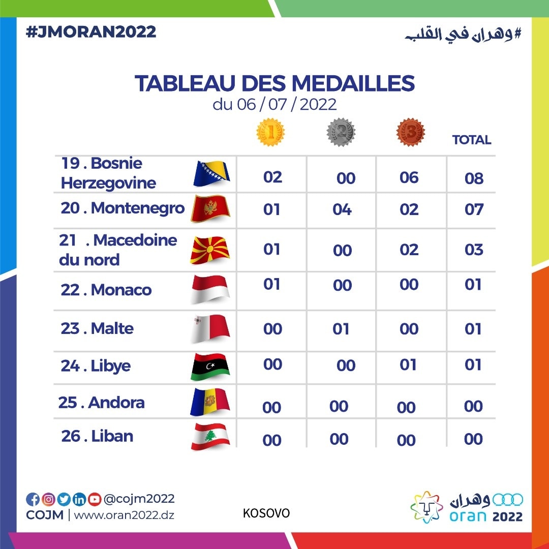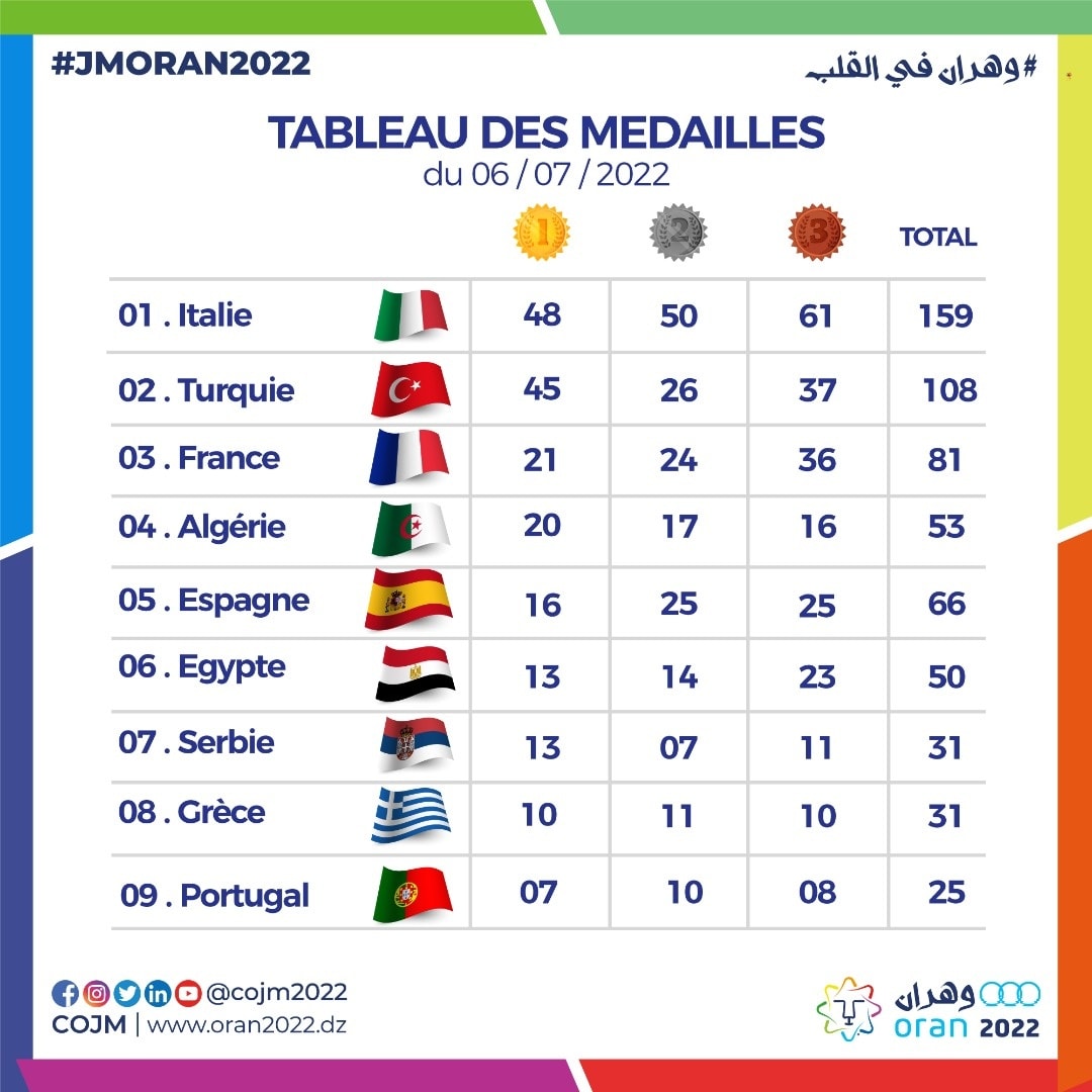 Organisée du 25 juin au 6 juillet a Oran, la 19e édition des JM enregistre la participation de 3.390 athlètes issus de 26 pays.