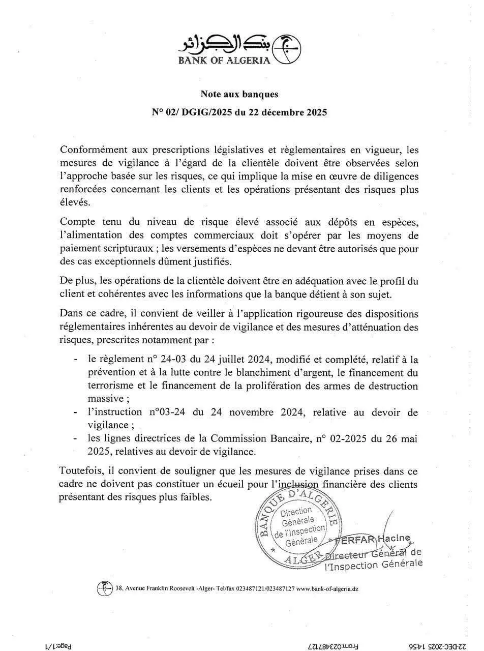 À travers une note adressée aux banques et datée du 22 décembre 2025, la Banque d’Algérie impose un durcissement significatif des conditions d’alimentation des comptes commerciaux.