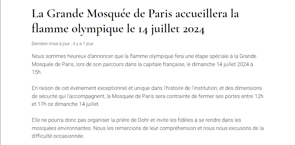 « Nous sommes heureux d’annoncer que la flamme olympique fera une étape spéciale à la Grande Mosquée de Paris, lors de son parcours dans la capitale française, le dimanche 14 juillet 2024 à 15h », a indiqué la GMP dans un communiqué.