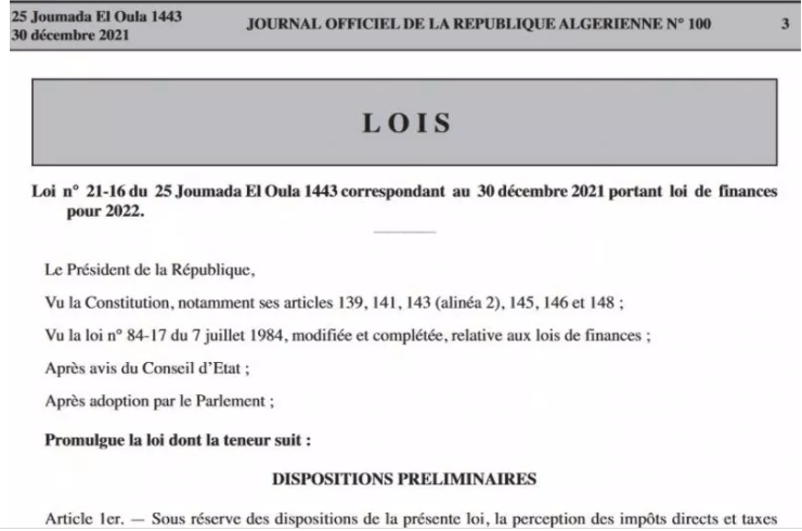 La loi de finances de l’exercice 2022, signée jeudi dernier par le président de la République Abdelmadjid Tebboune, a été publiée au dernier Journal officiel (n° 100).