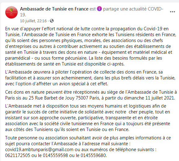 «L’Ambassade de Tunisie en France exhorte les Tunisiens résidant en France, qu’ils soient des personnes physiques, morales, des associations ou des chefs d’entreprises ou autres a contribuer activement au soutien des établissements de santé en Tunisie a travers des dons en nature (équipement et matériel médical et paramédical) ou sous forme pécuniaire», a fait savoir la mission diplomatique sur son compte Facebook.